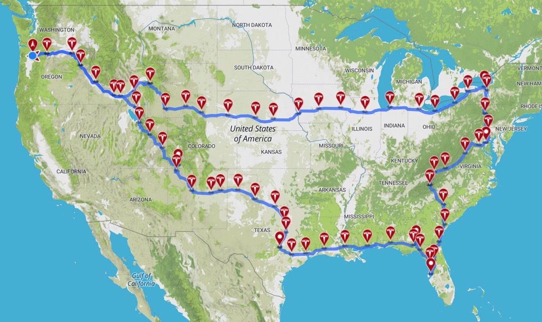 We’ve plotted our path using A Better Route Planner. This is our rough plan. Charging takes about 30 minutes at Superchargers and we can go 150-200 miles/charge. We can also plug in at many RV campsites.
