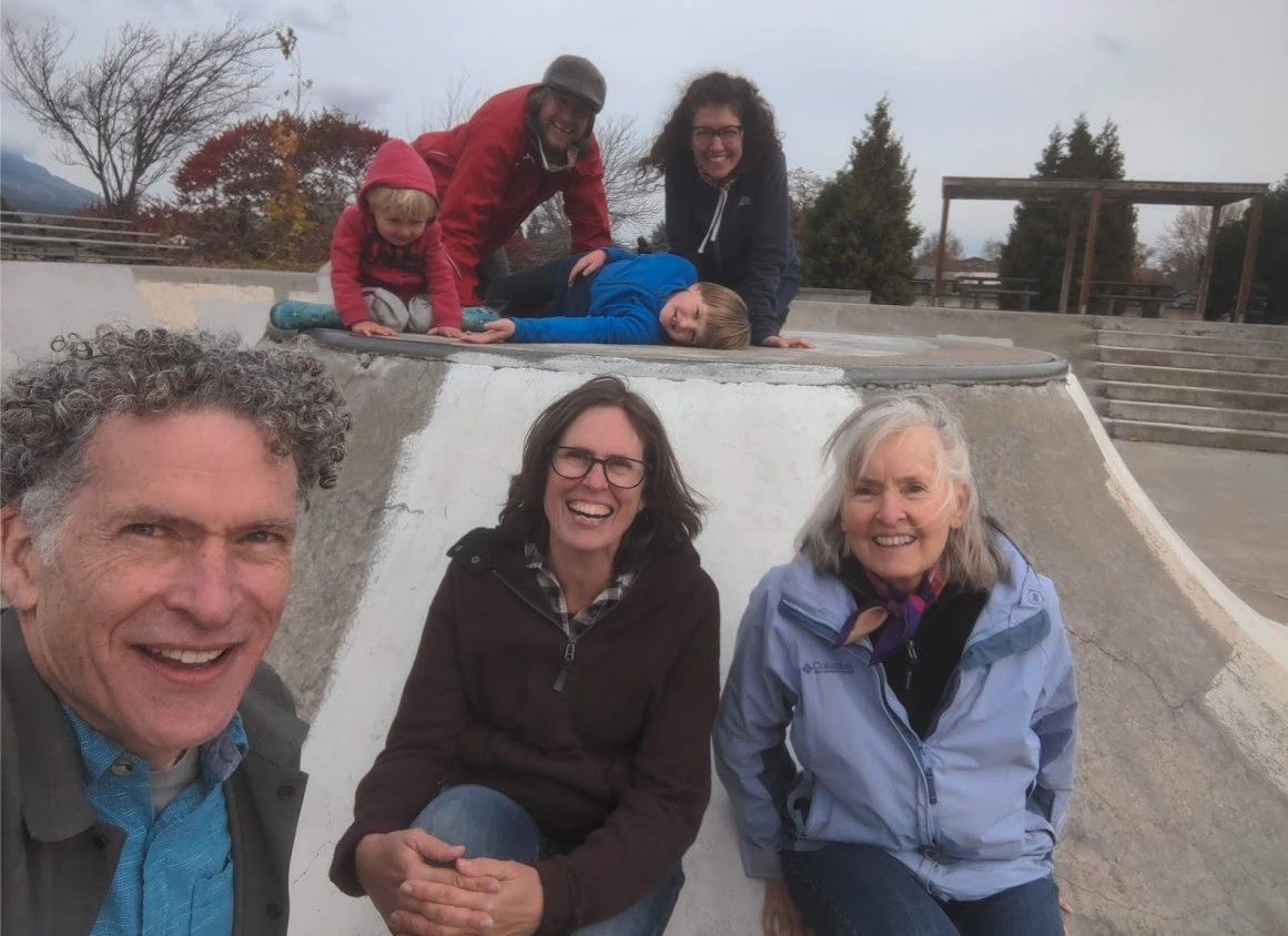 The next morning we drove to La Grande, and had a rambunctious belated 8th birthday celebration with our nephew Thomas and his amazing family (Aaron, Anne, Eamonn & Aaron’s mom Paula). Highlight of that visit was running around the local skateboard park. Here were are in a pause in that action: