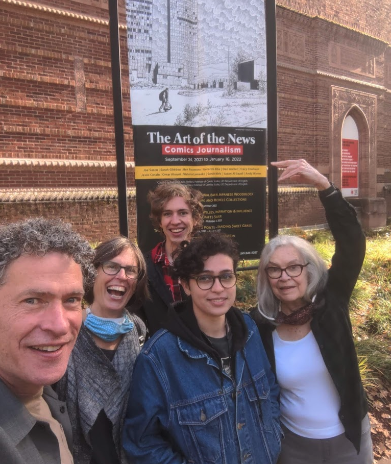 We got home late that night and had a lovely dinner at our neighbor John’s Distillery/Grill, “Shine”. We could have called our trip done then, but decided to close the circle by going back to Eugene - since dropping Colin off at UO was the instigating “empty nest” event for the whole trip. We picked up my mom and went to the UO Art Museum where a number of Audra’s portraits were the unifying element of their “The Art of the News: Comics Journalism” exhibit: